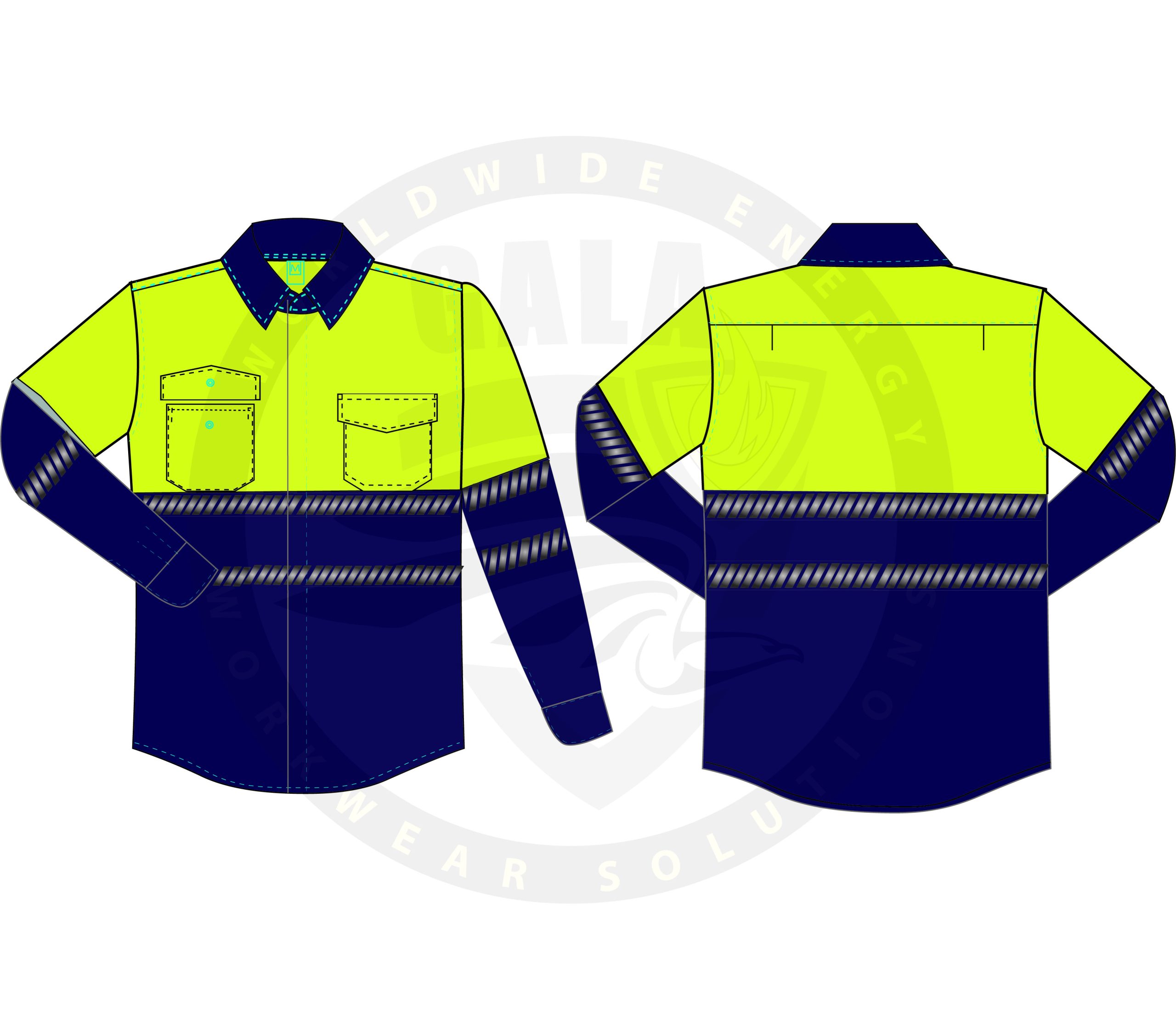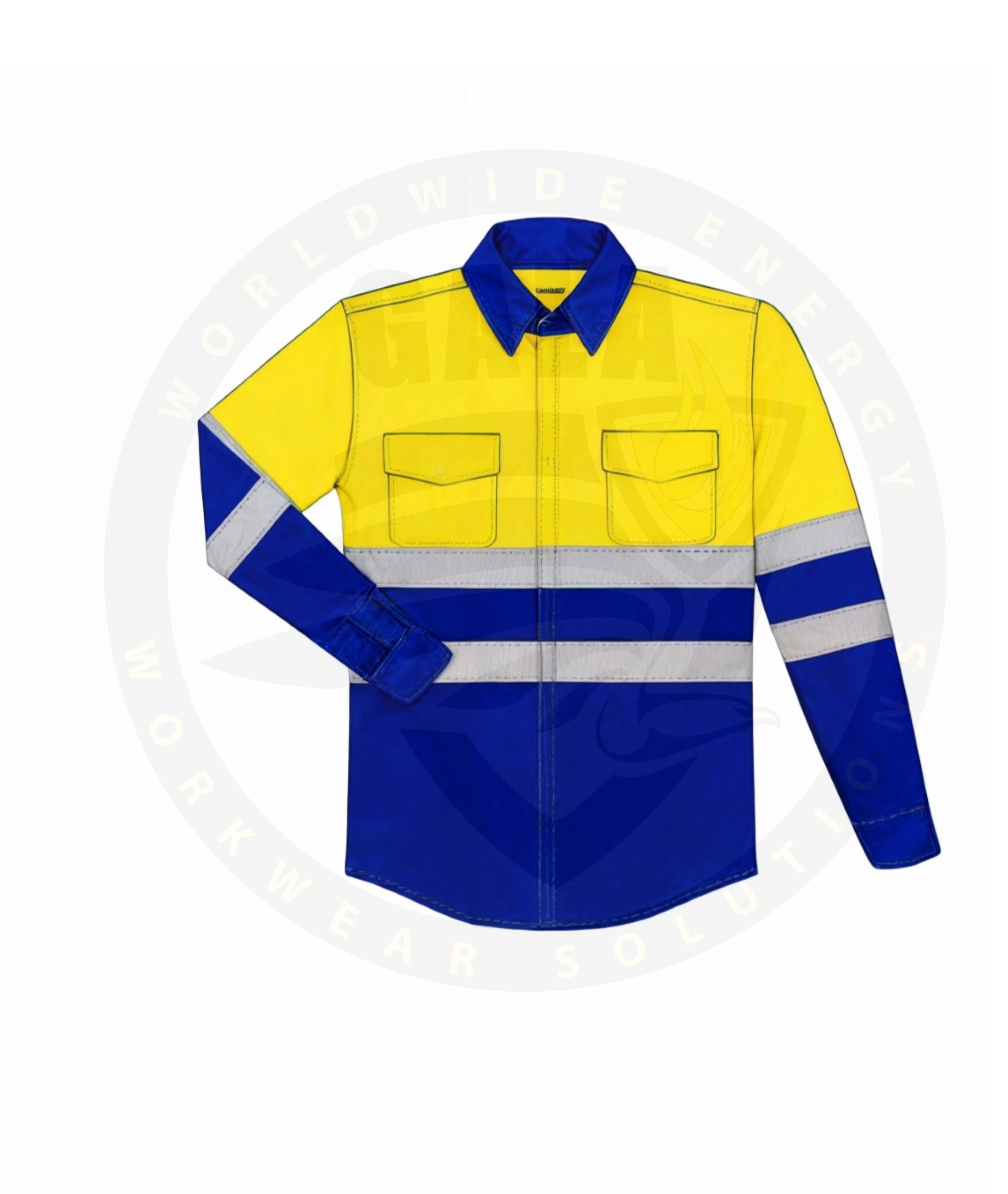Camisa BICOLOR permanentemente ignífuga y antiestática Clase 2. Cinta reflectante en contornos doble. Cierre con botones cubiertos por tapeta. Dos bolsillos superiores con tapeta y cierre de botón. Puños con cierre por botón (Opción cierre broches).